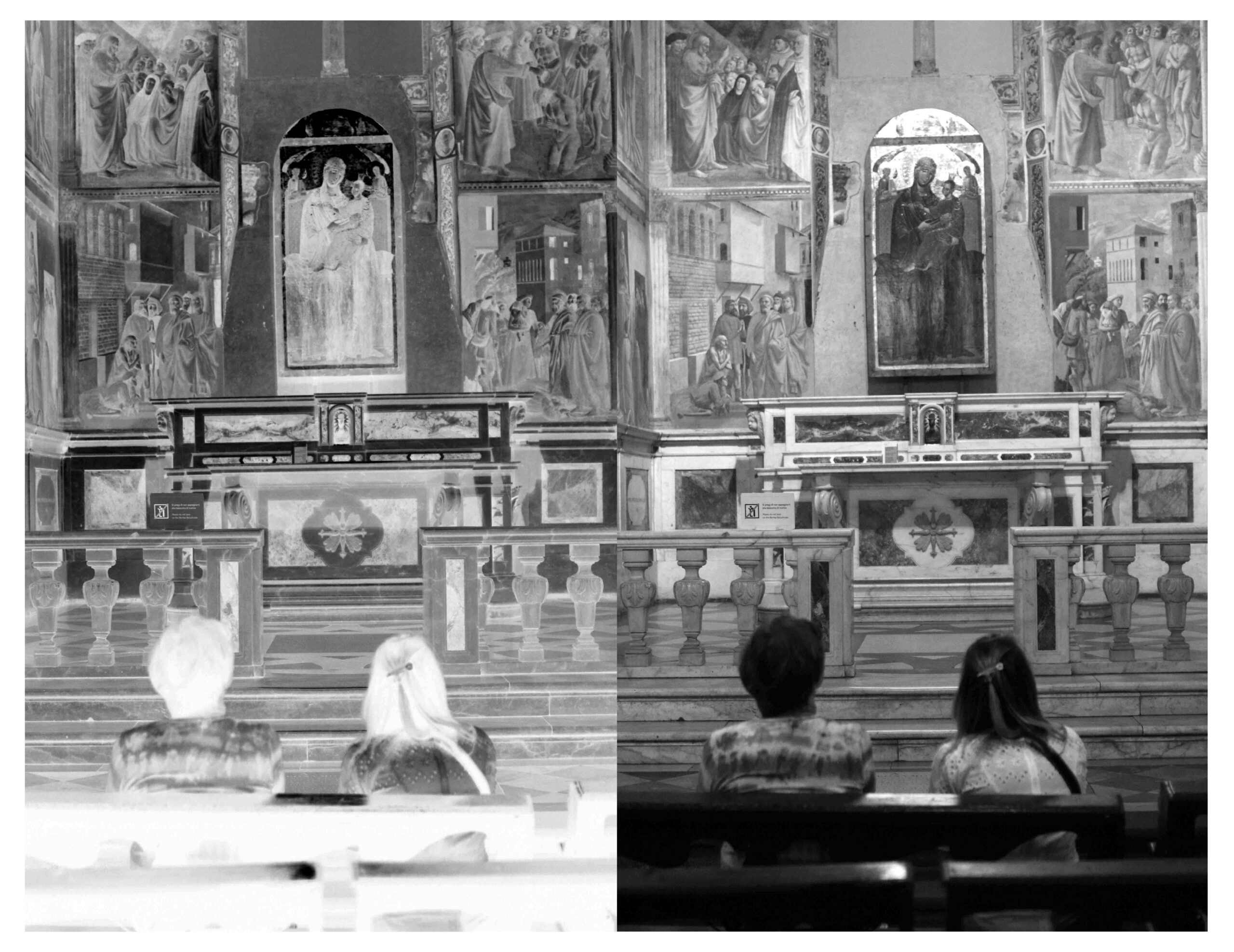 The original image is in this case monochrome, it has no colours and thus it has one less feature of reality. Moreover, every picture, whether colored or monochrome, has the ability to capture only one moment, but reality is constantly changing. In the end, a “negative” looks like an imprint of the original image. Where white is present, black is pictured and the other way around the same.